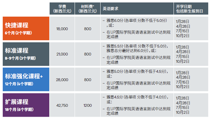 预科课程设置灵活,在奥克兰和惠灵顿每年有4次开学。学生可以选择6个月至18个月不同长度的大学预科课程。顺利完成大学预科课程的学生可以保证升入相对应的大学:奥克兰大学、AUT大学和惠灵顿维多利亚大学等……UP教育集团的大学预科文凭被新西兰所有大学接受和认可。
