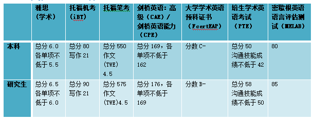 - 持非NCEA,CIE(NZ)或IB资格证书报读大学的国际学生必须满足雅思或同等类型考试的分数要求,或者成功完成大学学术英语预科证书FCertEAP,奥克兰大学本科生英语直通班(EPUS),奥克兰大学研究生英语直通班(EPPS),或其他受认可的选择。