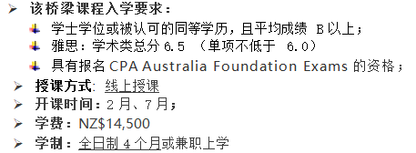 - 入学要求:学士学位或被认可的同等学历,且平均成绩 B以上;CPA 初级会员(CPA Australia Associate Membership);雅思:学术类总分6.5(单项不低于 6.0)
